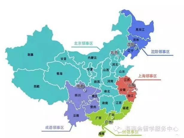 1.北京领区:北京、天津、陕西、山西、甘肃、河南、河北、湖北、湖南、青海、新疆、宁夏、西藏、内蒙古2.上海领区:上海、安徽、浙江、江苏、江西3.沈阳领区:辽宁(除大连市)、吉林、黑龙江4.广州领区:广东、海南、福建、广西5.重庆领区:重庆、四川、贵州、云南6.青岛领区:山东7.香港领区:香港、澳门